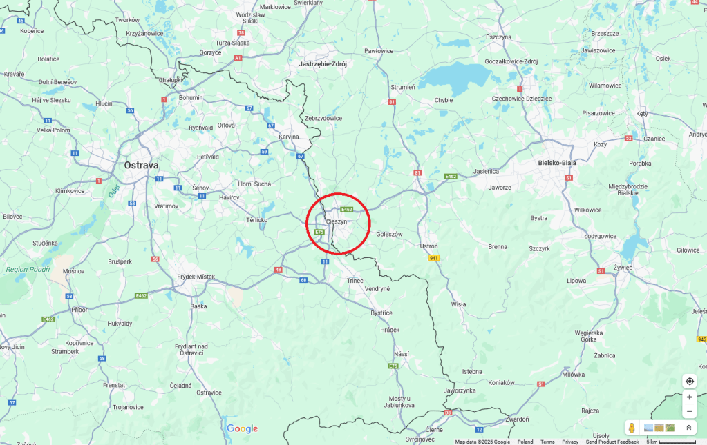 February 2023 I went to 🇵🇱 Cieszyn by train to teach mahjong. The train had a change at 🇵🇱 Goleszów. I had a small tour around the town, then went through the bridge, which is the border between 🇵🇱 Poland and 🇨🇿 Czech Republic, to 🇨🇿 ÄŒeský TěšÃn.