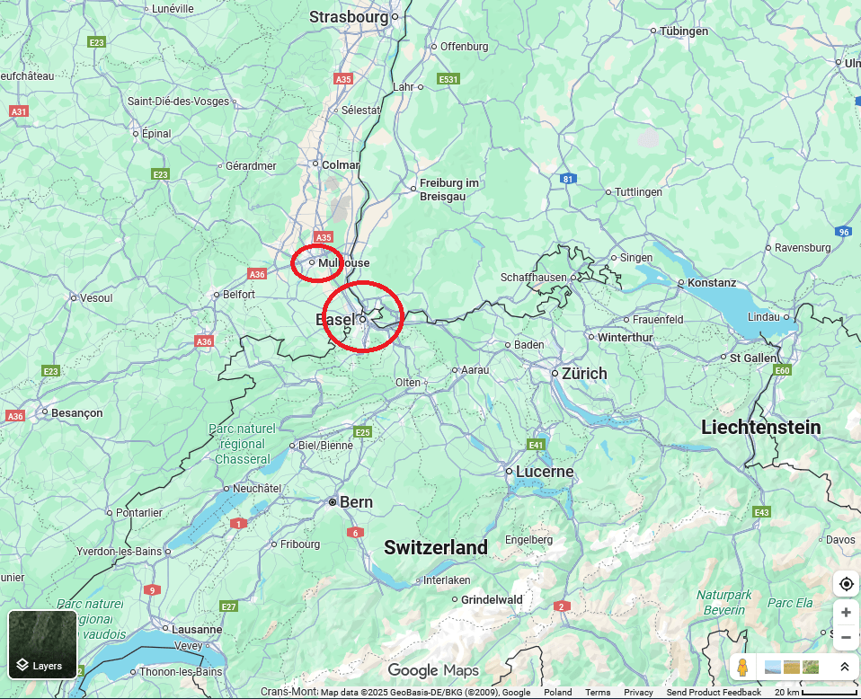 The cheapest flight from Istanbul was to Euro Airport, the airport is interesting with its 2 exits one to ๐ซ๐ท France and one to ๐จ๐ญ Switzerland. First I went walking to ๐ซ๐ท Saint-Louis to take train to ๐ซ๐ท Mulhouse where I rented a place. On the next day I went by train to ๐จ๐ญ Basel, which was my first time in Switzerland, excluding an airport. From Basel I walked to ๐ฉ๐ช Weil Am Rhein, ate currywurzt – the local German speciality and then walked to ๐ซ๐ท Saint-Louis to take train back to ๐ซ๐ท Mulhouse.